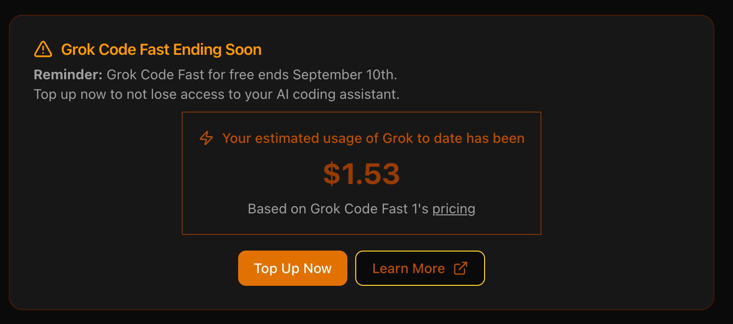 I've been using Grok Code Fast inside Kilo Code during their free trial, and it's significantly improved my development velocity. The free access ends September 10th, and I'd like to request budget approval to continue.