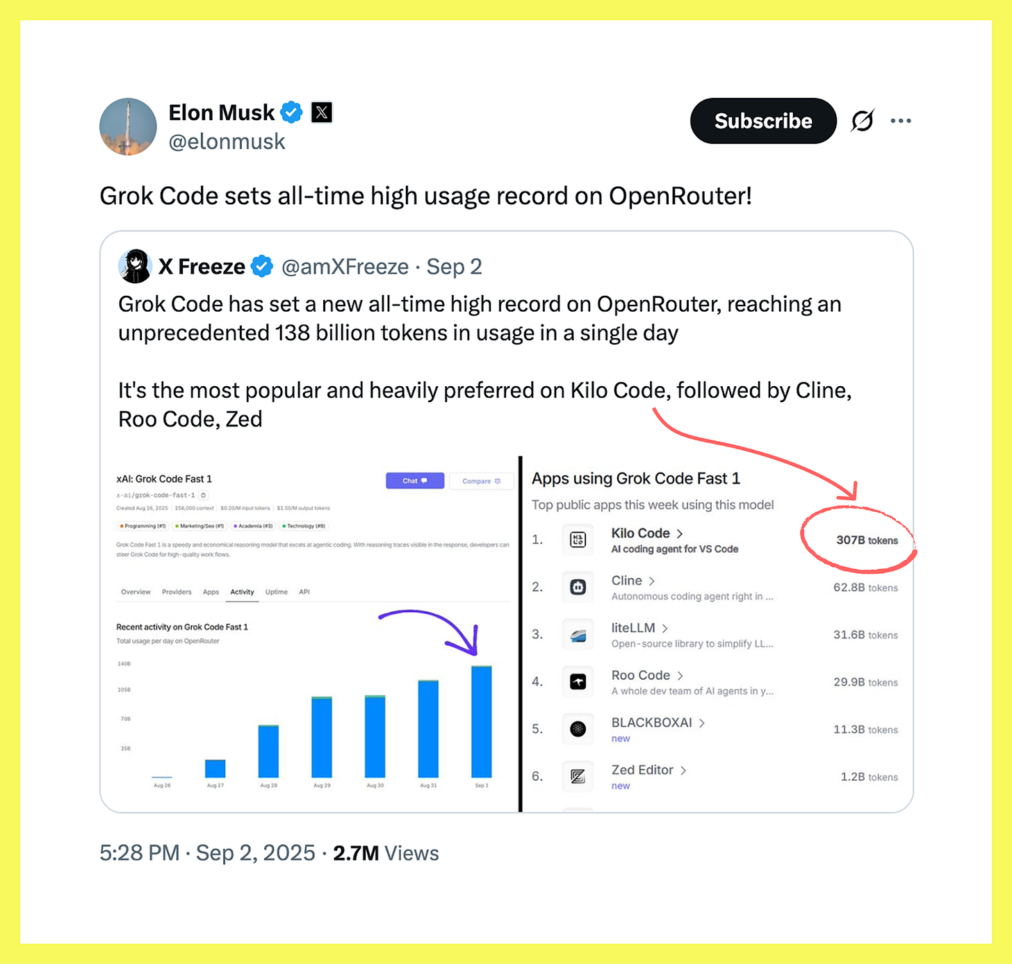 And unlike other models that ship and then seem to stagnate or get sore, xAI has been shipping improvements daily since they launched “Sonic” as a stealth model. The model you’re using today is measurably better than the one from last week. And to top that off, when Elon tweets about your coding tool's performance, you know something big is happening.