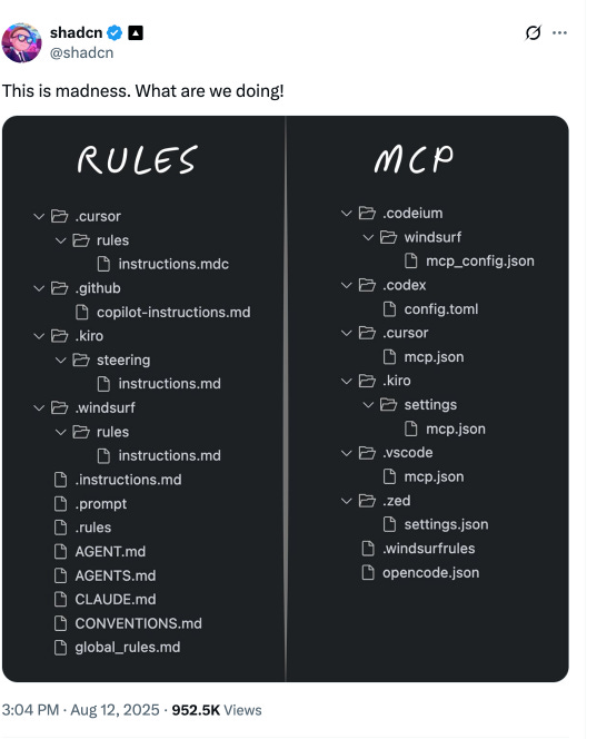 The problem with different rules for different agents is: Change. AI models change (you have a new AI model being released almost every week). AI coding assistants change. And many of us like to use multiple code assistants (ask it to solve something for us, come up with 3-4 versions, choose the best output).
