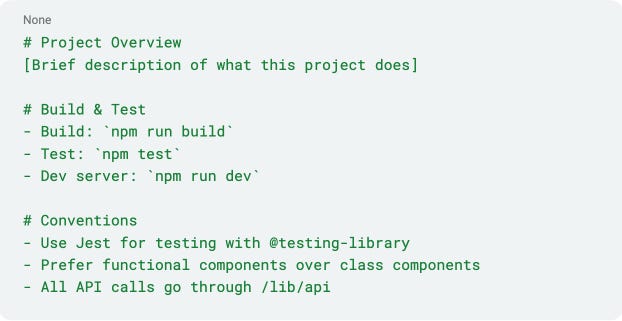 Basically, anything you'd tell a new teammate on their first day. Unlike with your teammate, here you get instant gratification; the AI coding agent will get your file and be mindful of everything you said starting from your first prompt.