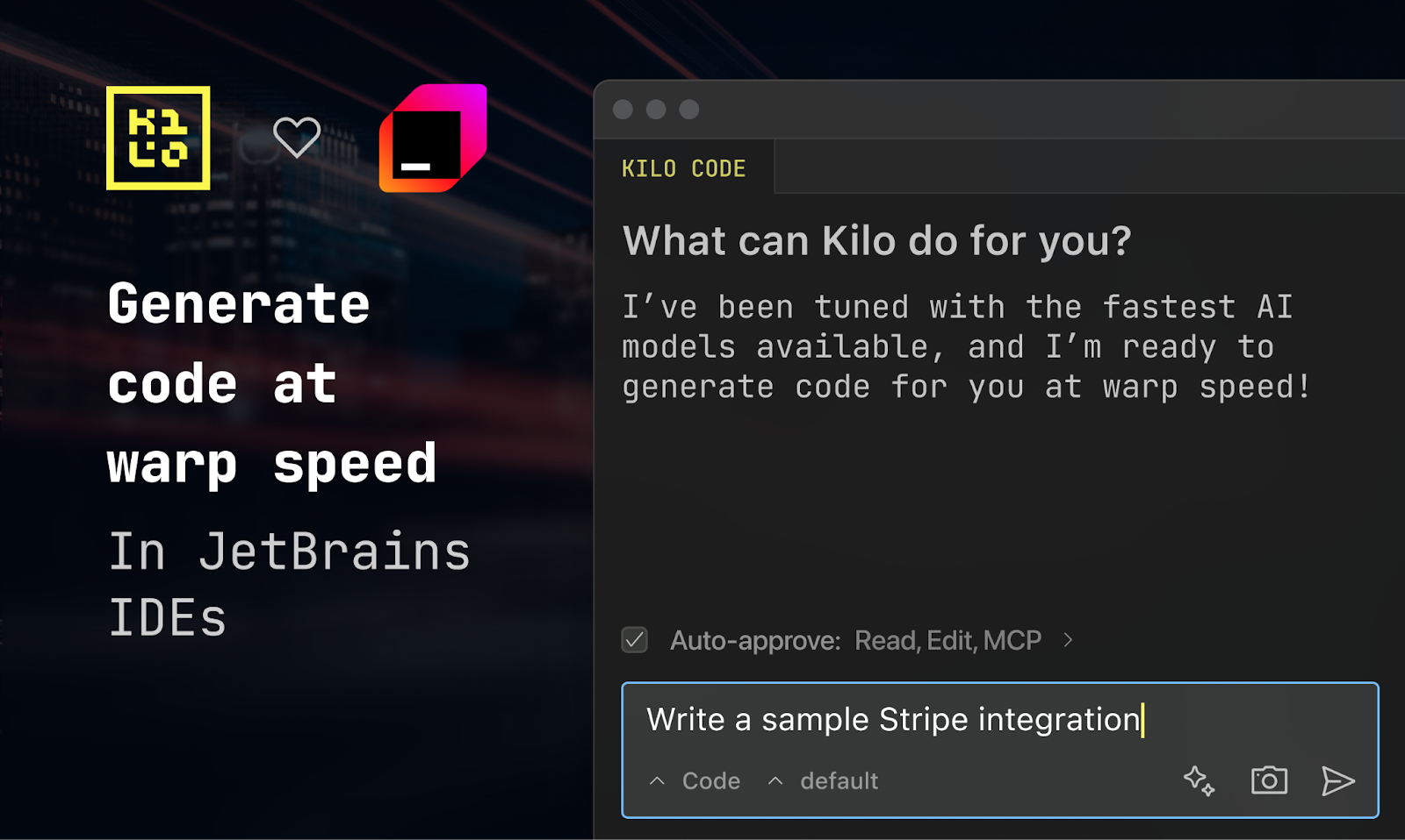 Kilo Code is an open-source, model-agnostic AI code assistant with transparent pricing. Today, we're bringing that same transparent philosophy, plus all our powerful agentic coding capabilities, to IntelliJ IDEA, PyCharm, WebStorm, and other popular JetBrains IDEs.