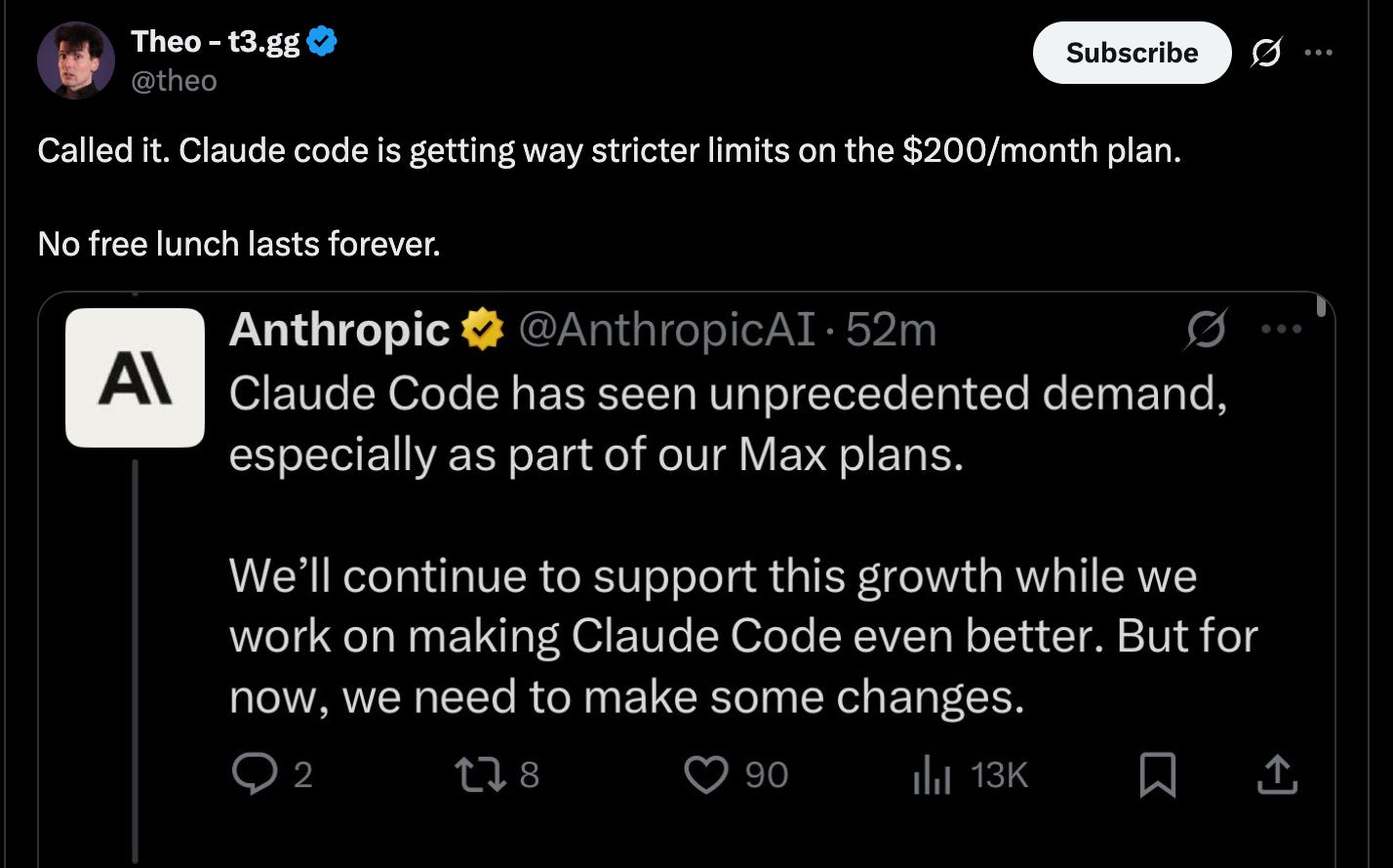 Bottom line: Anthropic just added weekly limits to Claude Pro ($20/month) and Claude Max ($200/month), affecting their heaviest users of Claude Code…mid-workflow.