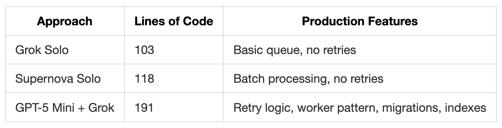 Where Code Supernova bundled everything into a single payload parameter, Grok Code Fast 1 separated job type from job data, making it easier to categorize and route different job types.