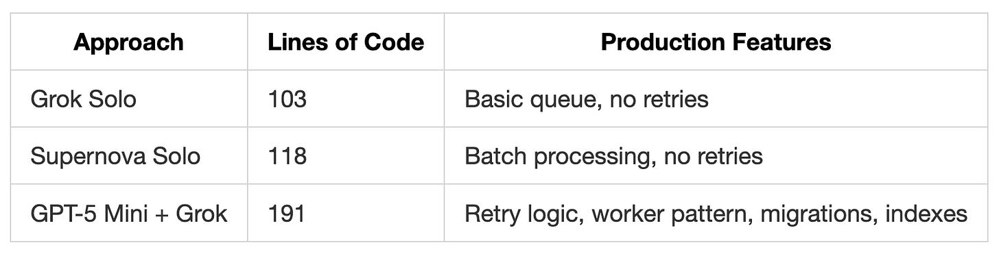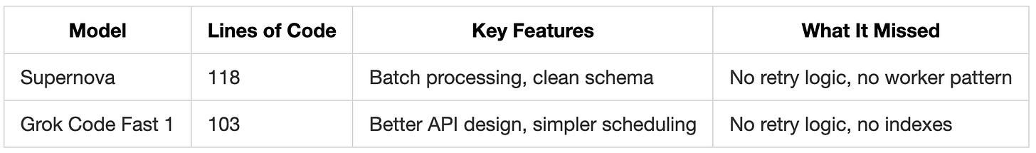 TL;DR: Code Fast 1 performs on par with Code Supernova while generating cleaner code. Our tests also found that pairing GPT-5 Mini for planning with Grok Code Fast 1 for implementation creates an affordable workflow that delivers much better code than using either model alone.