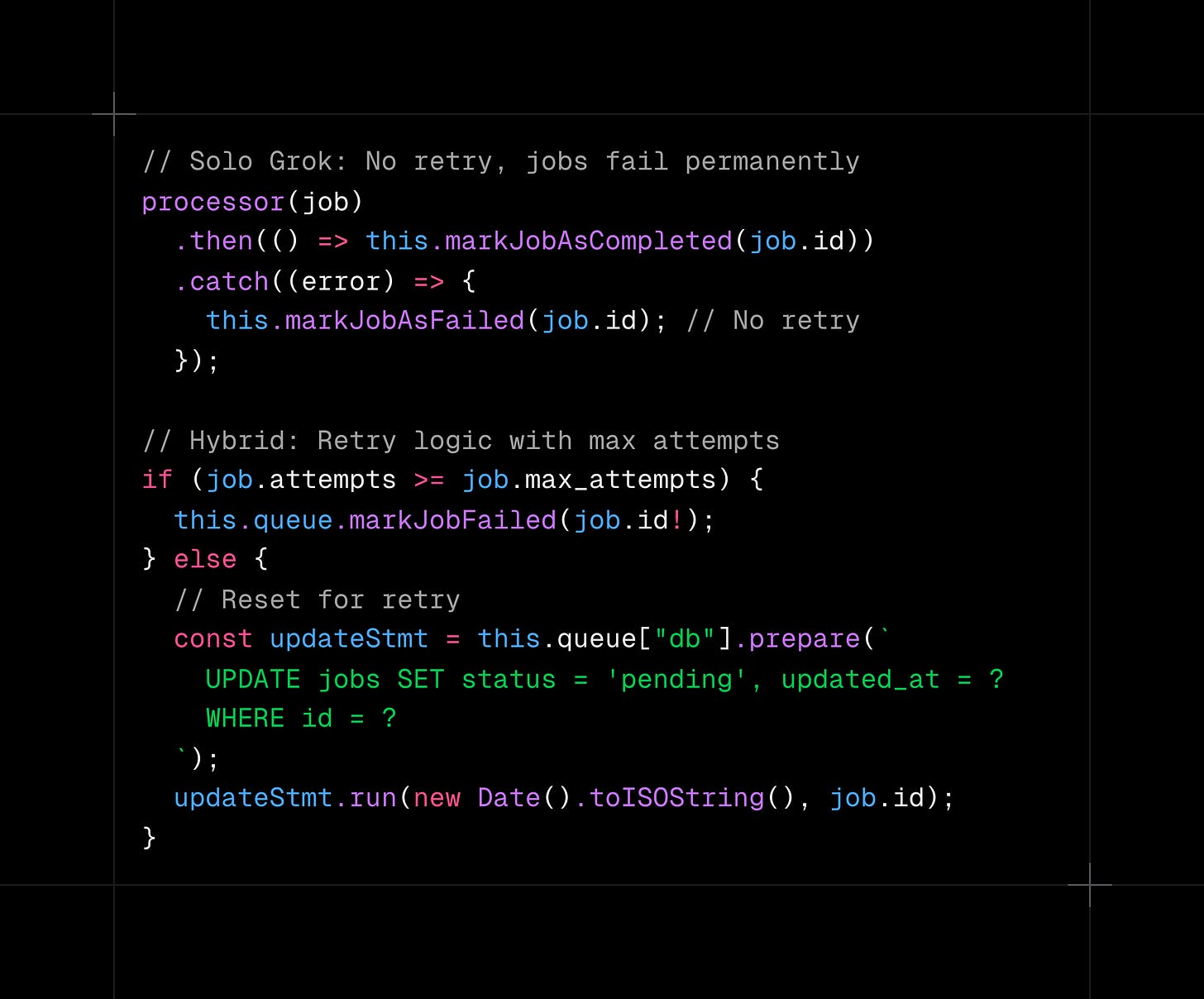 Separate type and data parameters: Grok used addJob(type, data, delay) with distinct parameters for job type and payload. Code Supernova bundled everything into a single payload parameter, requiring developers to implement their own type system within the JSON payload.