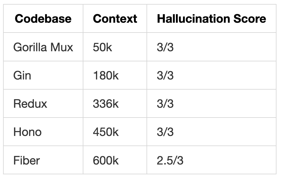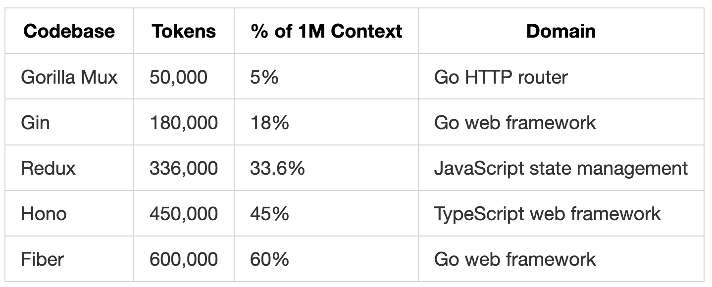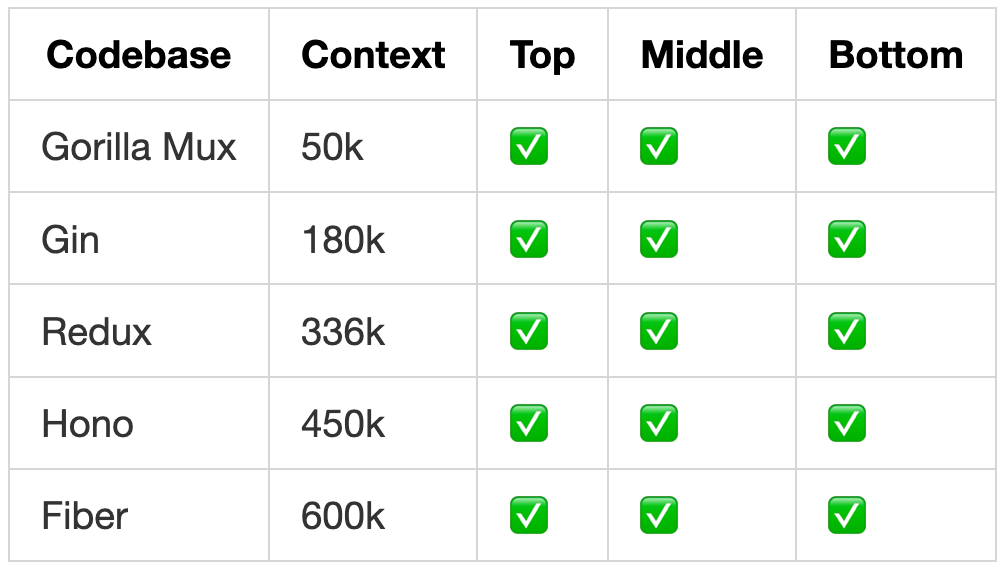 Unlike previous context window studies that used essay collections or synthetic text, we used actual open-source codebases as our test corpus. This provides realistic code structure, cross-references, and hierarchical organization found in production contexts.