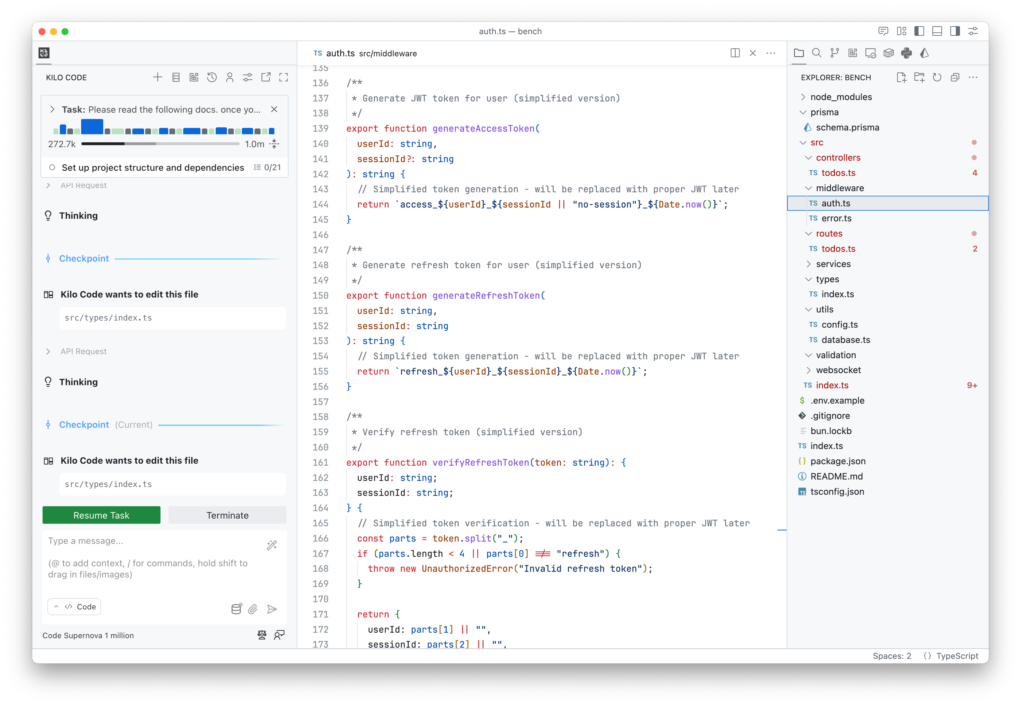 We saturated the context with approximately 200k tokens of documentation, then asked Supernova to build a sophisticated todo list application using Bun, TypeScript, SQLite, Prisma, and Hono. We used Architect mode in Kilo Code with Supernova to plan out the architecture for the todo list, then switched to Code mode in Kilo Code to start implementing the architecture that was previously designed.