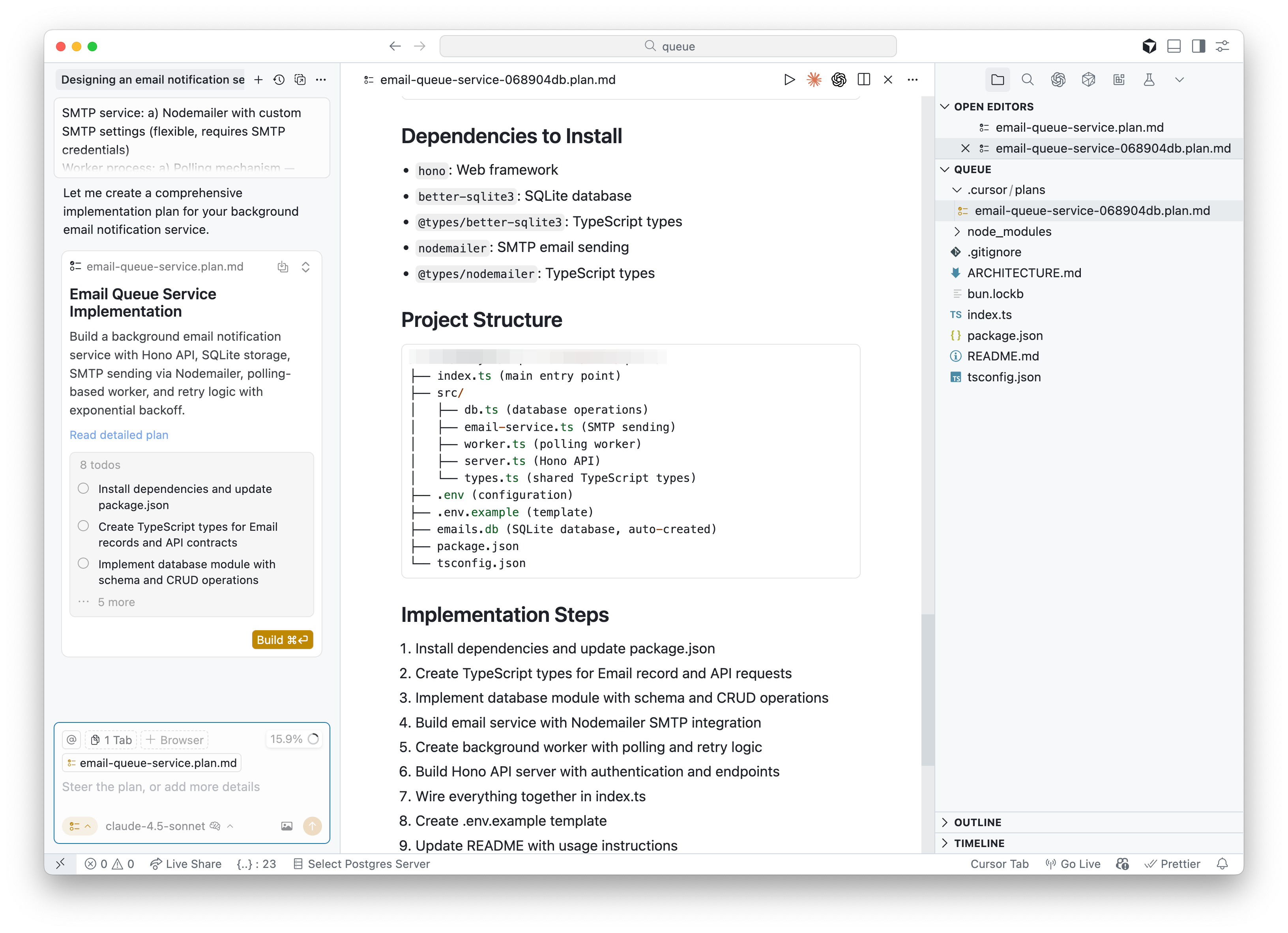 We tested both agents by asking them to design a background email notification service (using Cursor’s Plan mode and Kilo’s Architect mode).