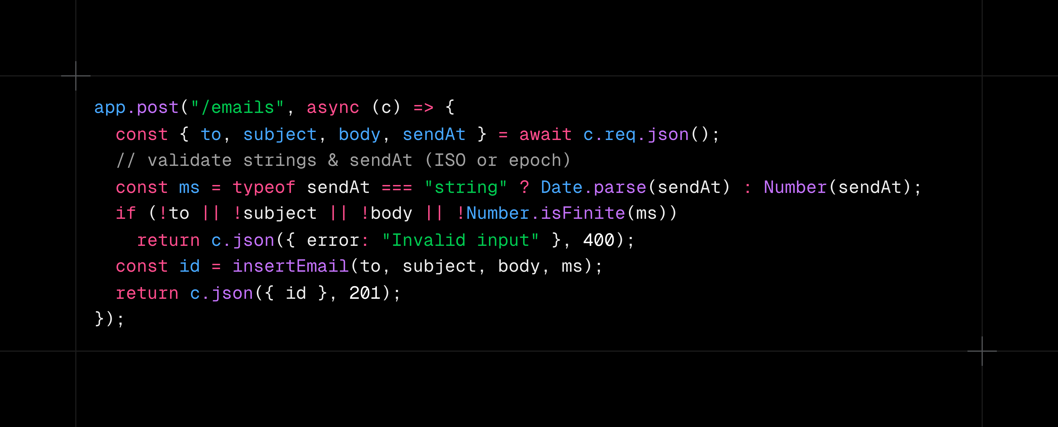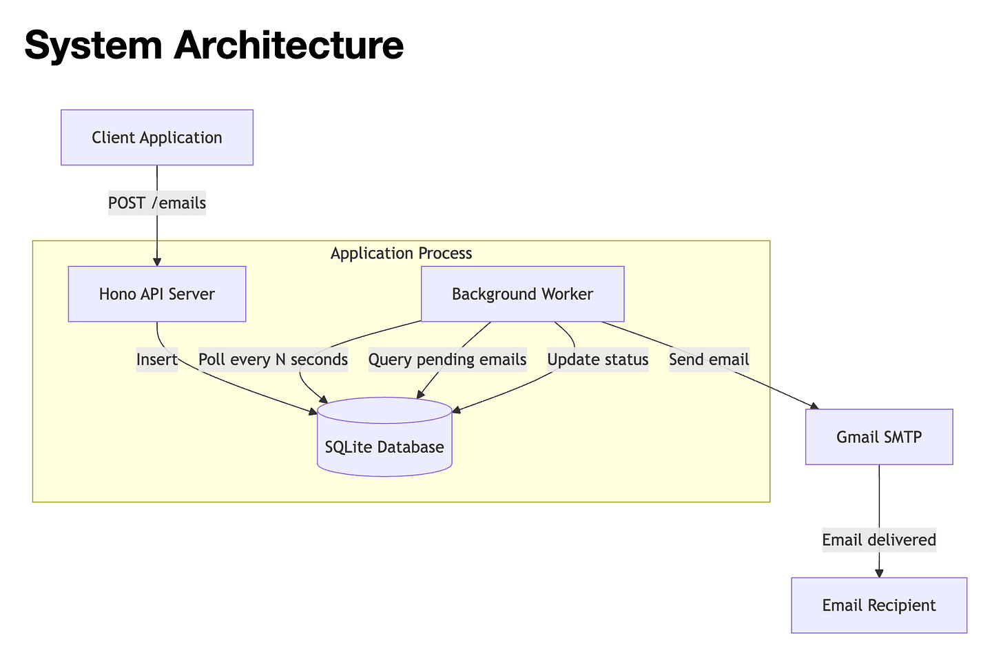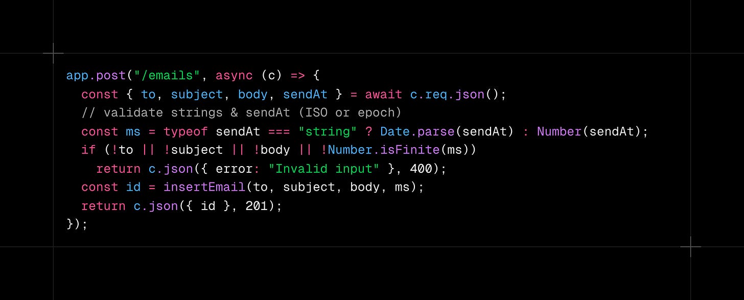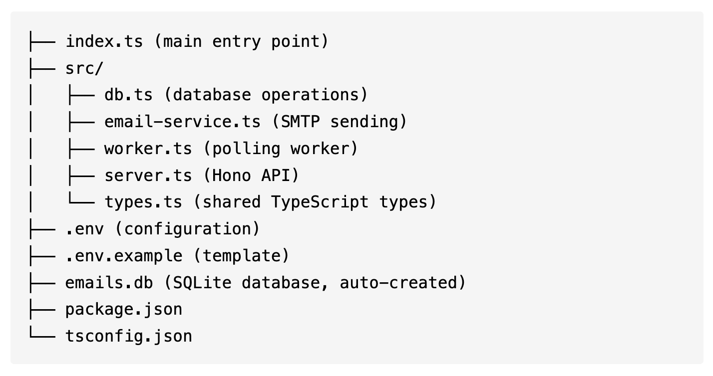 I’m building a background email notification service using Bun, Hono, TypeScript, and better-sqlite3. It should let me schedule emails with to, subject, body, and sendAt fields, store them in SQLite, and send them later through SMTP. How would you design and implement this?