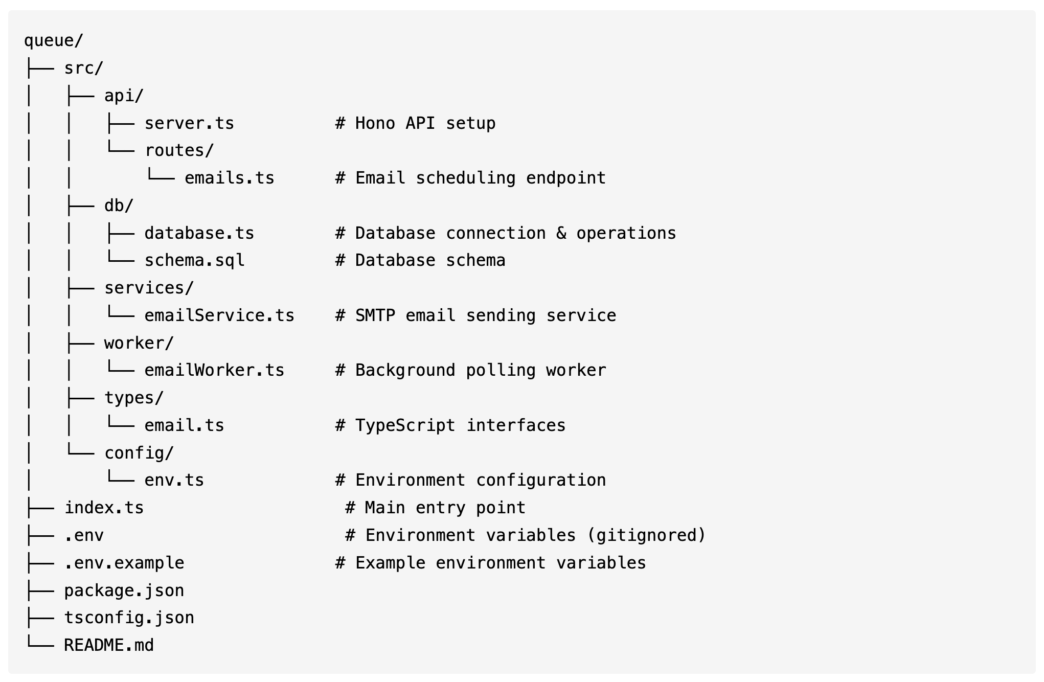 Nested module structure (email/smtp.ts, worker/scheduler.ts)