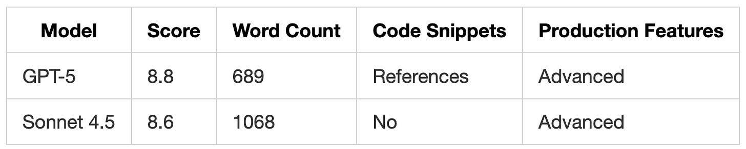 Claude Sonnet 4.5 delivered more detailed plans with full explanations (averaging 894 words.)