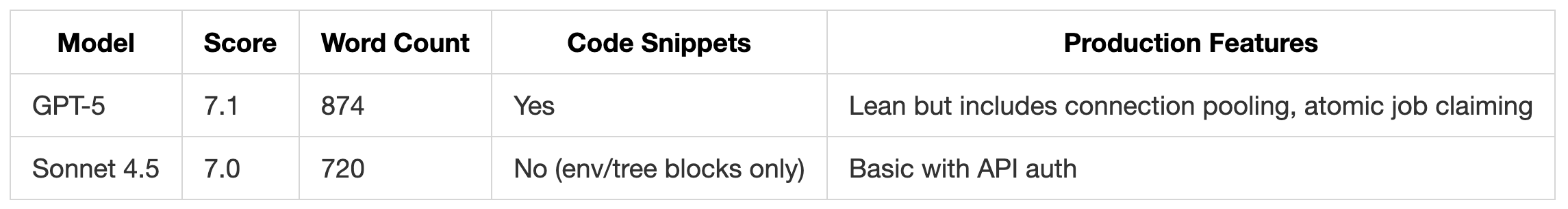 The plans addressed more edge cases and production concerns. GPT-5 (9.5/10 reliability) in Kilo used transactional claiming to prevent race conditions, exponential backoff with jitter, and message ID tracking for idempotency. GPT-5 (8.0/10) in Cursor covered the essentials for reliable delivery in a simpler architecture.