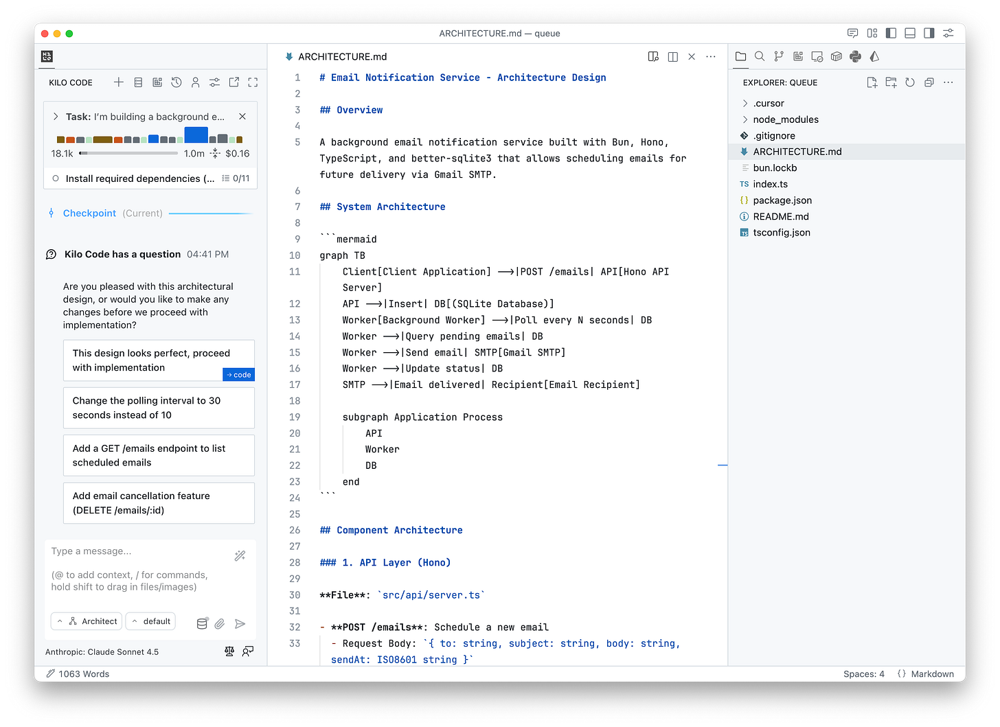 Sonnet 4.5 in Kilo’s Architect Mode generated Mermaid diagrams for system architecture and process flows, and incorporated security considerations like rate limiting.