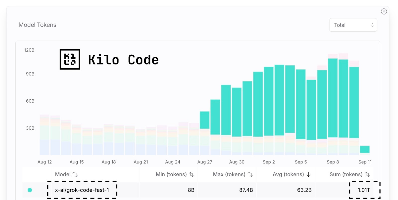 That’s exactly what’s happening with Grok Code Fast 1. In the last few days alone, Kilo Code has processed over 1 trillion tokens with this model: