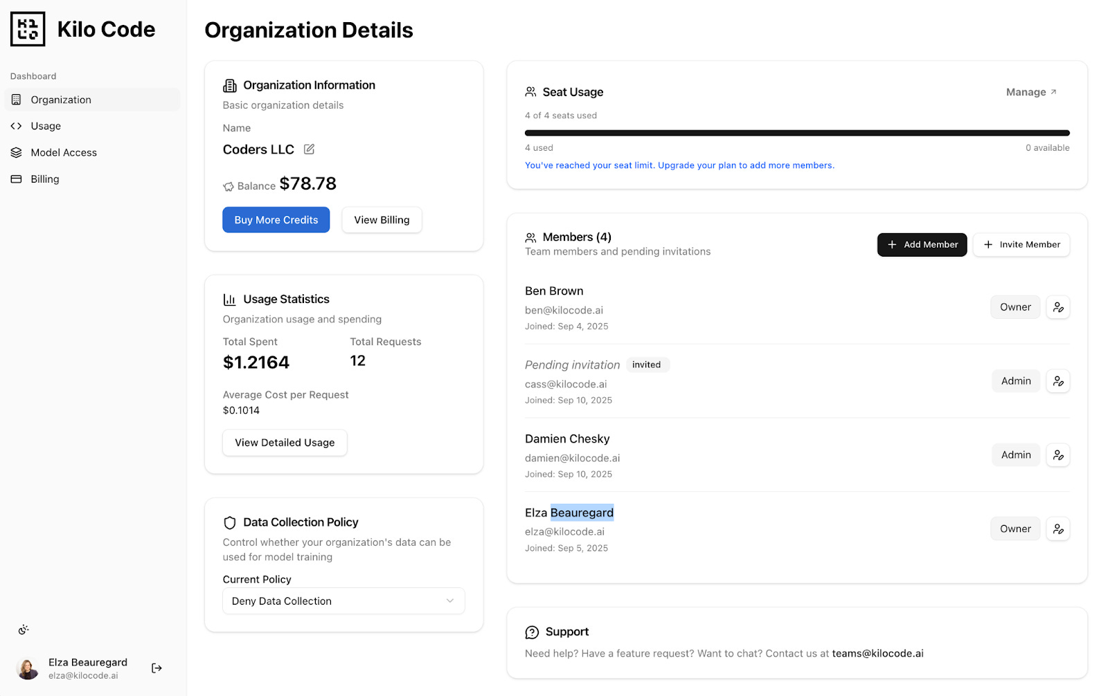 Once you’ve signed up for Kilo Code Teams and bought a few seats, you’ll see a dashboard: