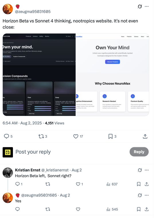 This model can be better than Sonnet or Opus 4, especially in tasks like generating good-looking UIs: