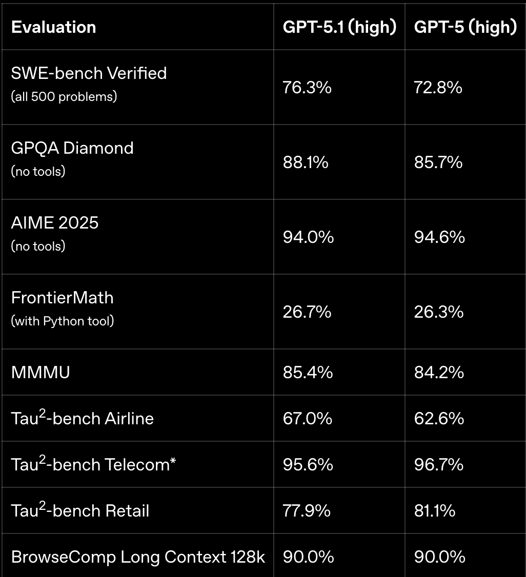 GPT-5.1 has implications for coding, “reflected in significant improvements on math and coding evaluations like AIME 2025 and Codeforces.”
