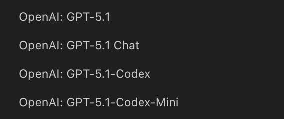 OpenAI has just released 4 new models: GPT-5.1, GPT-5.1 Chat, GPT-5.1-Codex and GPT-5.1-Codex-Mini.