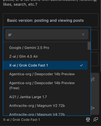 To use Grok Code, choose the Kilo Code provider (should be the default provider) and choose grok-code-fast-1 from the list: