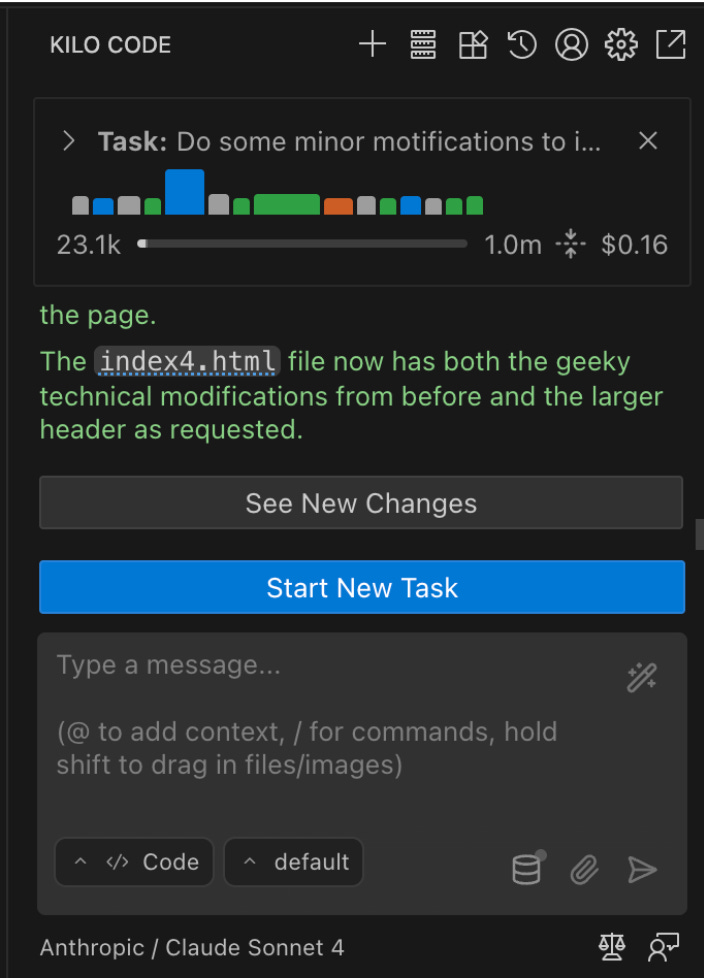 Let’s say you created a new task where you asked Kilo to make some minor modifications to a file.