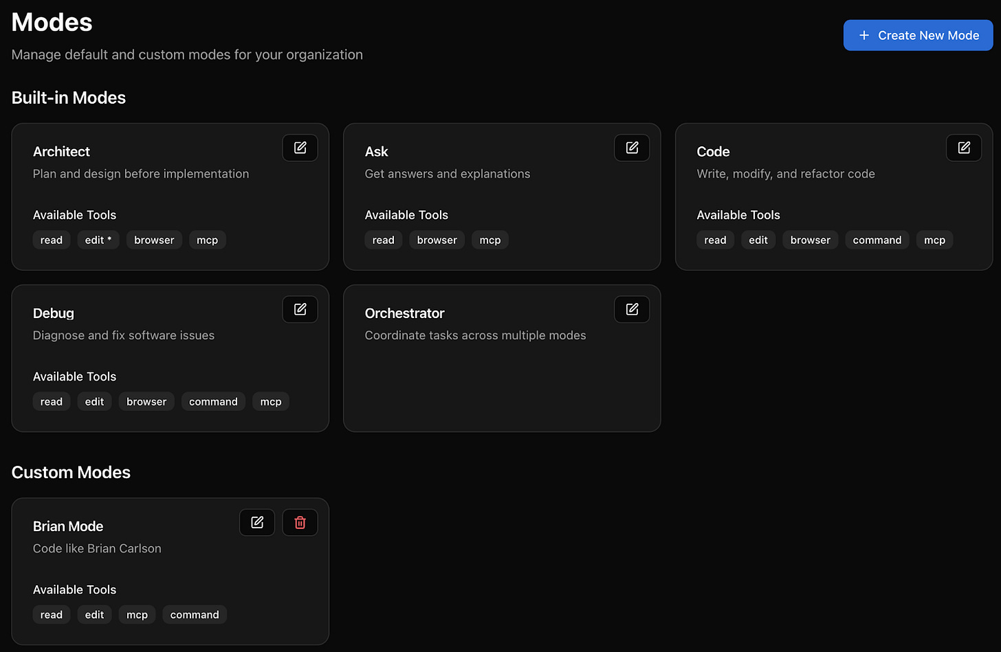 You can add modes or override existing ones, and you can edit them from your organization dashboard;
