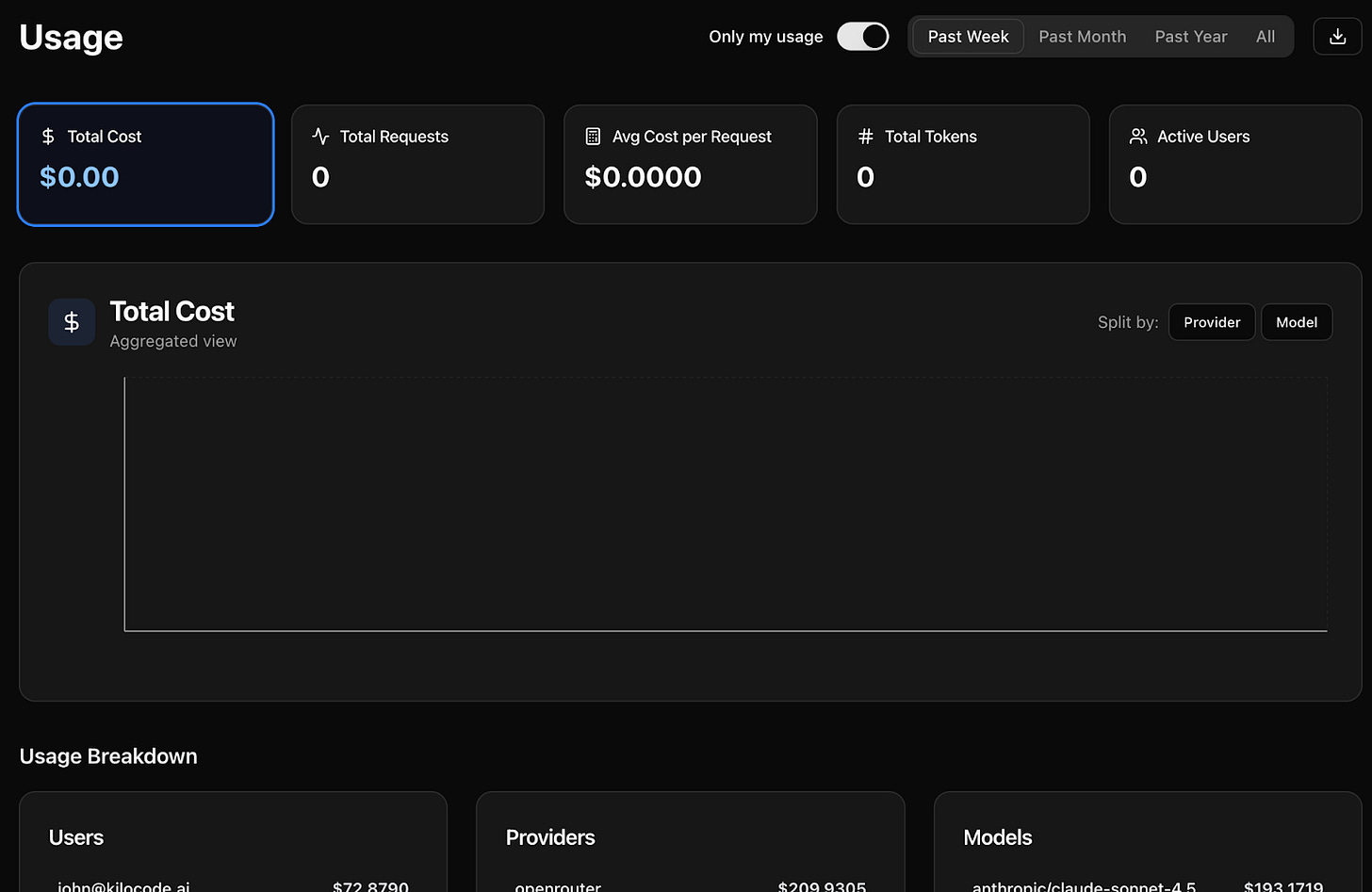 First; your Organization’s dashboard now has a Usage Statistics Panel that gives you a quick summary of your usage at a glance, but also an in-depth page that you can access by clicking on “View Detailed Usage.” There you can access Total Cost, Requests, and Tokens, a graph of Cost over time, breakdowns by Provider and Model, and Usage by Day and User! Who doesn’t love granular data?! (Sign up for Teams here!)