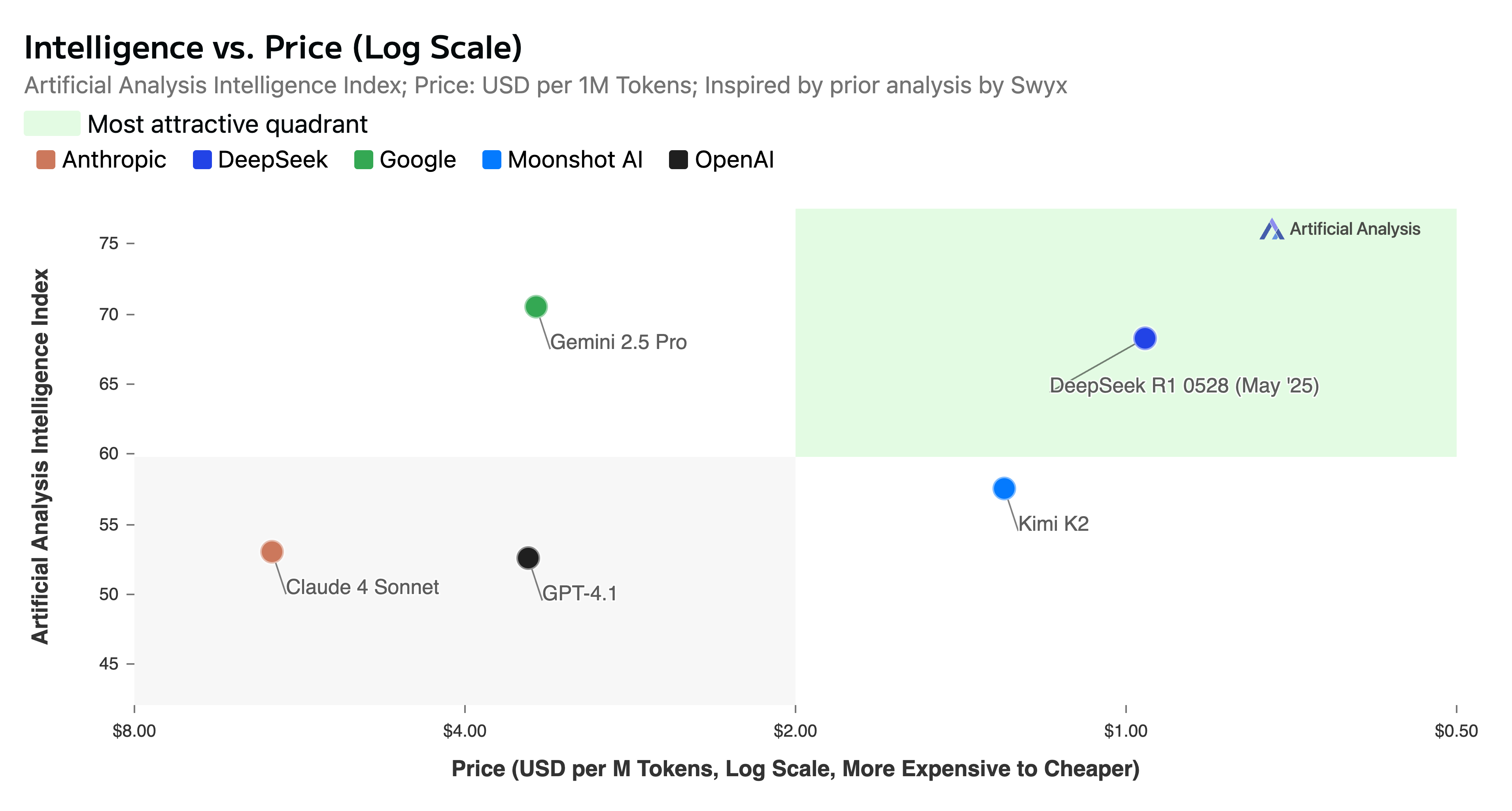 And compare intelligence on a log scale with the cost per token against some of the commercial and open source competition, and an interesting pattern of benchmark-to-price emerges: