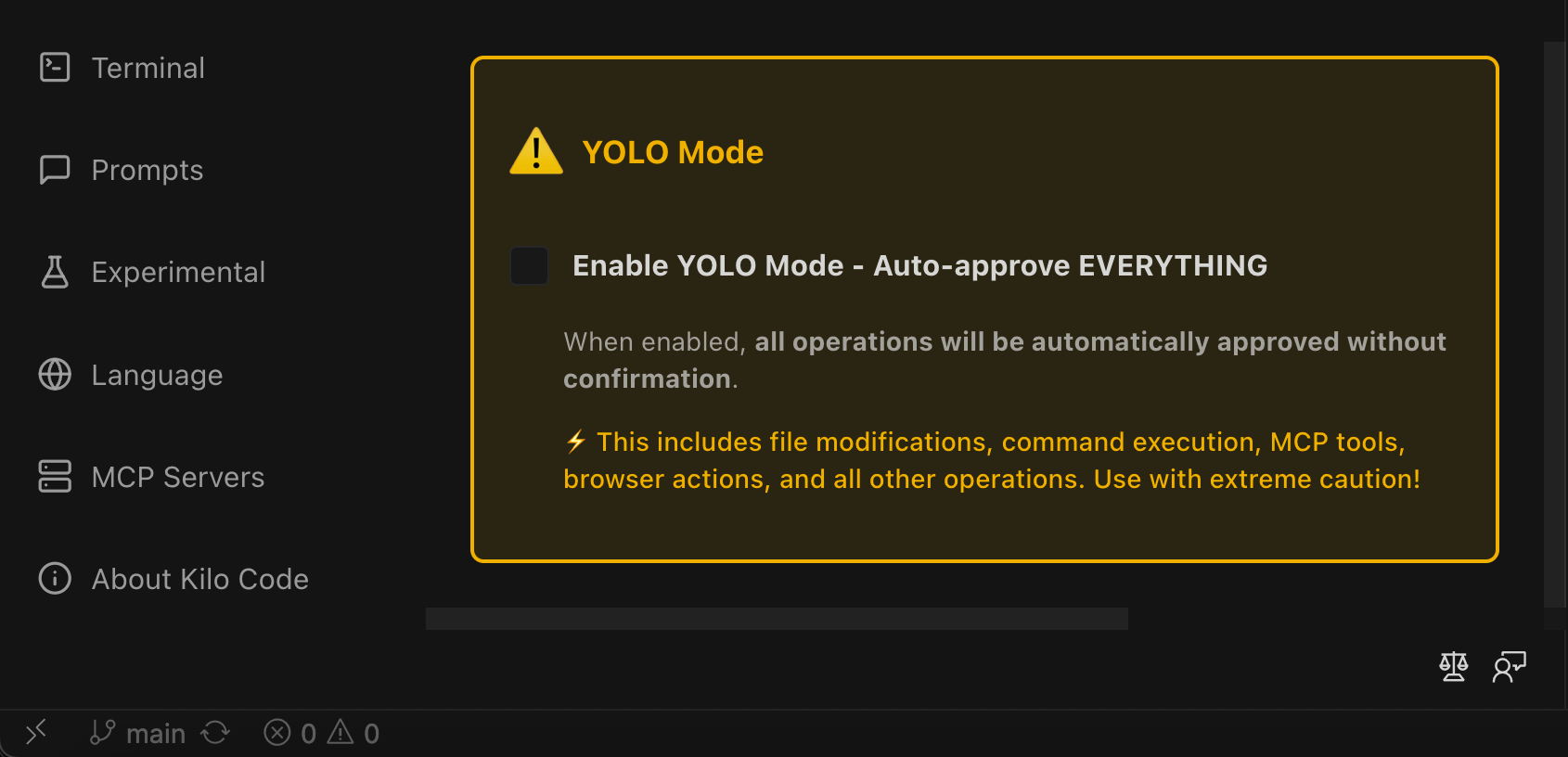 “You Only Live Once” (YOLO) mode grants Kilo Code full autonomy by automatically approving all actions — such as reading files, writing code, and executing commands.